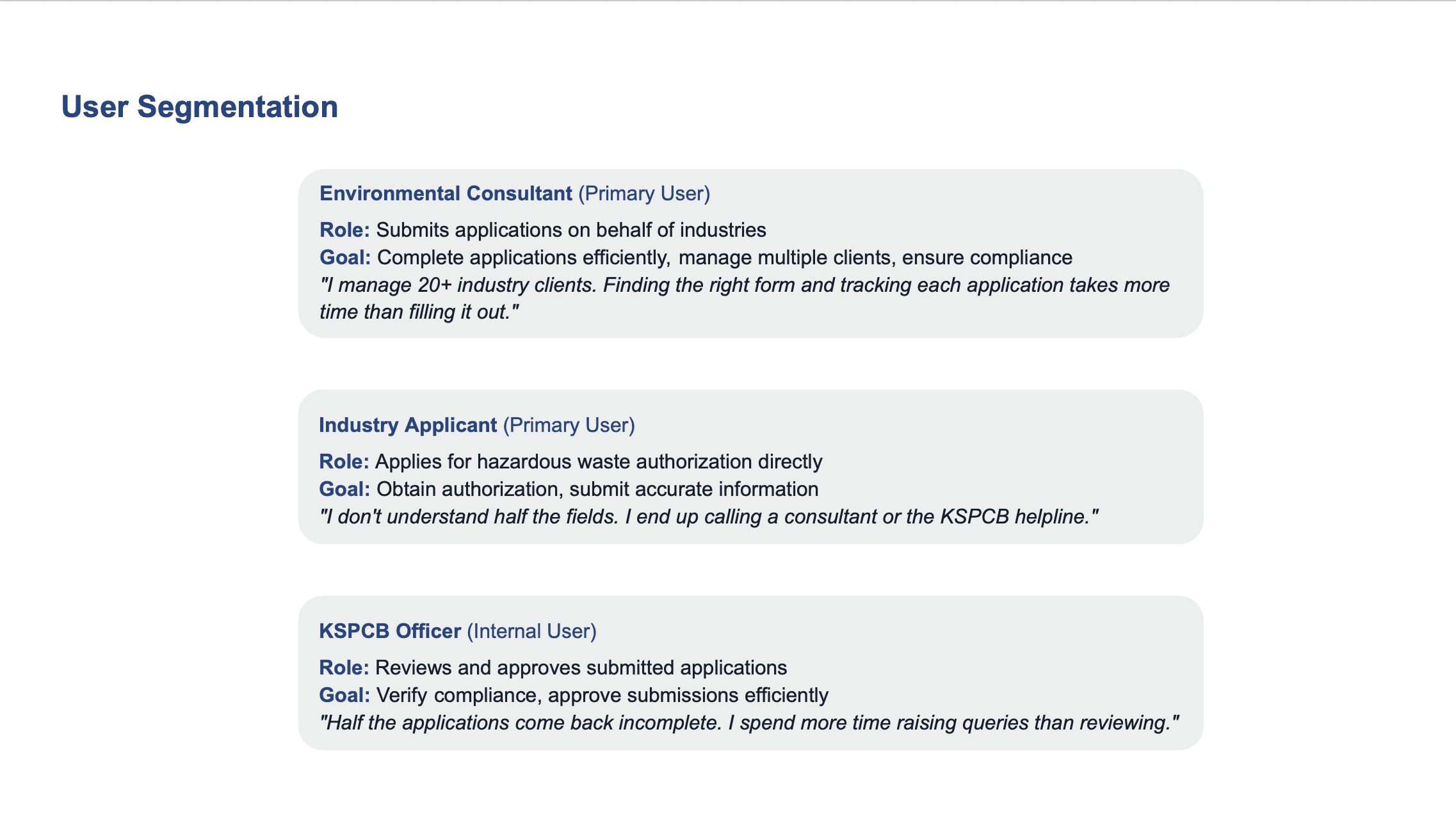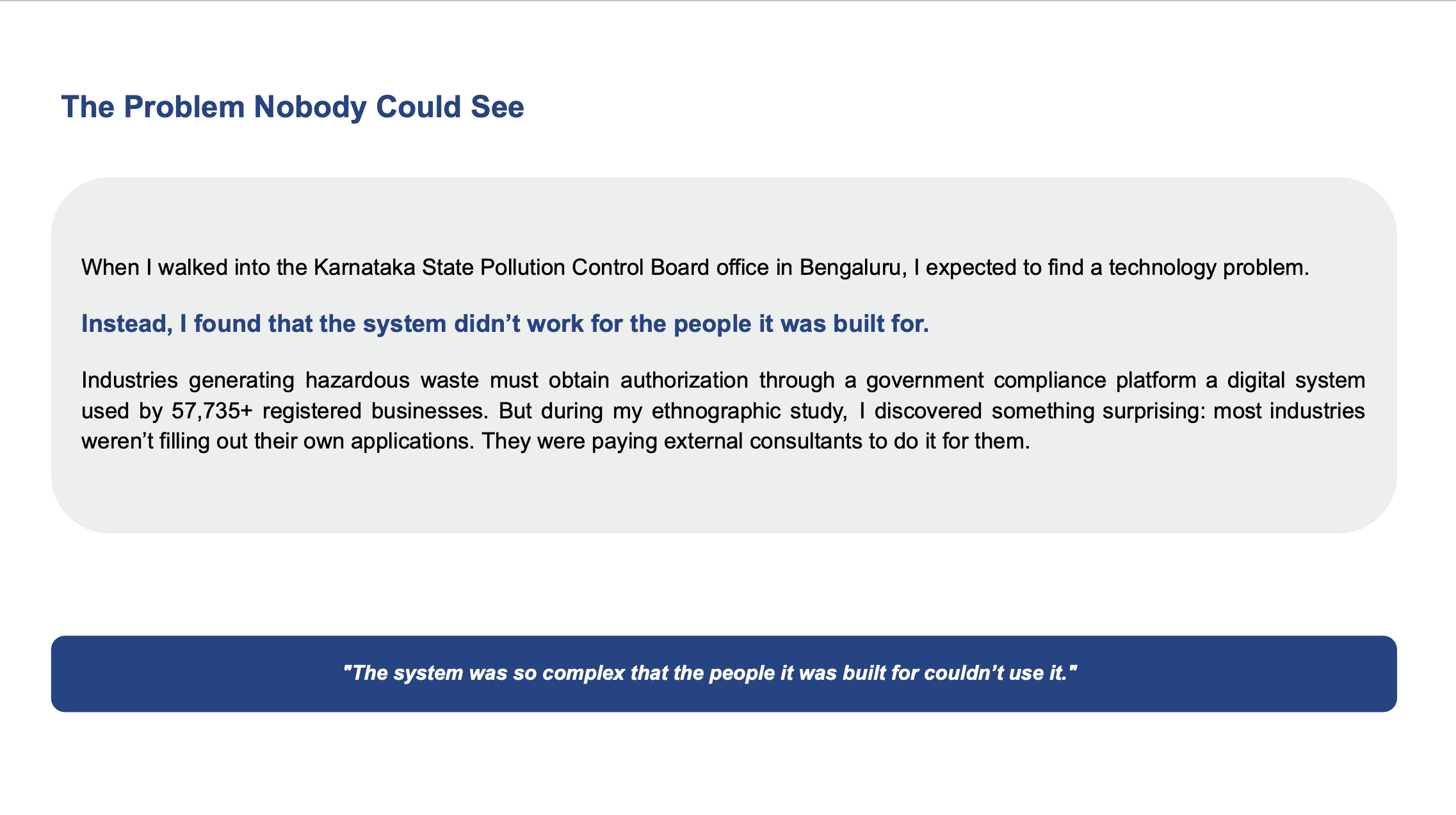 Walked into KSPCB, observed how 57,735+ industries struggle with a broken compliance system, and redesigned the most complex workflow into a guided, step-by-step experience.